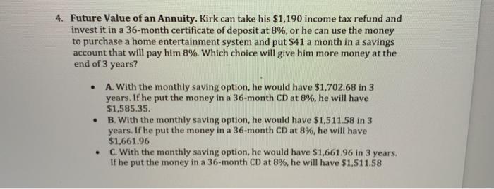 Solved 4 Future Value Of An Annuity Kirk Can Take His Chegg Com